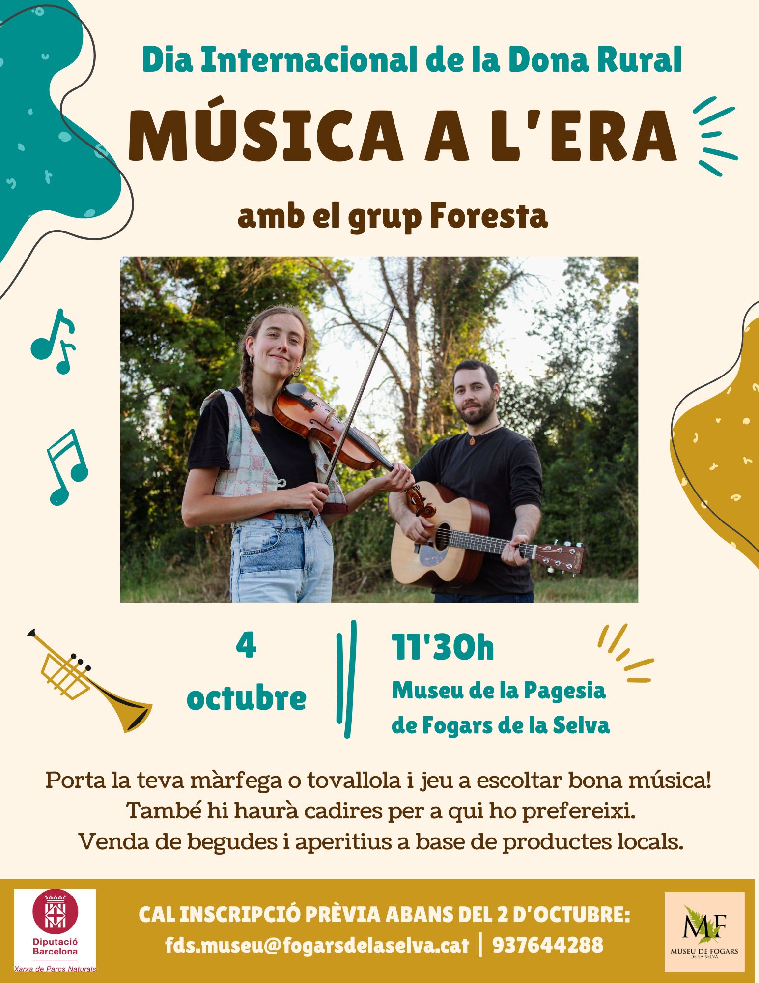S’acosta el Dia Internacional de la Dona Rural i, dins aquest marc, el dissabte 4 d’octubre t’hem preparat el "Música a l'Era", un matí perquè gaudeixis de bona música en un context informal i relaxat. Porta la teva màrfega o tovallola o, si ho prefereixes, també hi haurà cadires, i jeu a gaudir de la música tot fent un aperitiu a base de productes locals que tindrem a la venda al mateix Museu.