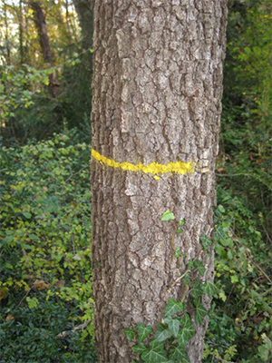 Identificación y marcaje de árboles objetivo (castaño con doble línea blanca) y de árboles a cortar (encina con raya roja). Autor: Joan Rovira. Diputación de Barcelona